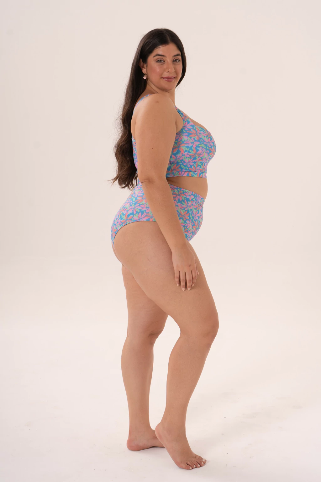 Bombacha realizada en tricot lycra estampada. Bombacha de cintura ancha con detalle de elástico embutido en el borde superior para mejorar el ajuste.